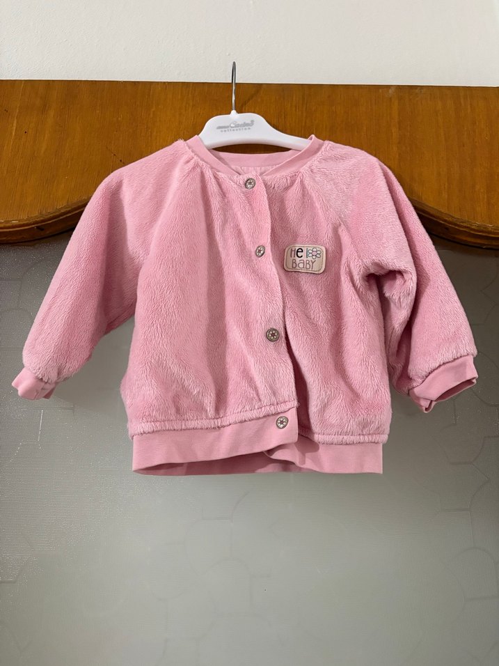 Bu pastel pembe kız çocuk polar ceket, düğmeli kapama ve yuvarlak yaka ile rahat bir kesime sahiptir. Yumuşak ve desensiz tasarımıyla gündelik kullanıma uygundur. Ebebek marka az giyildi 1 yaş ceket