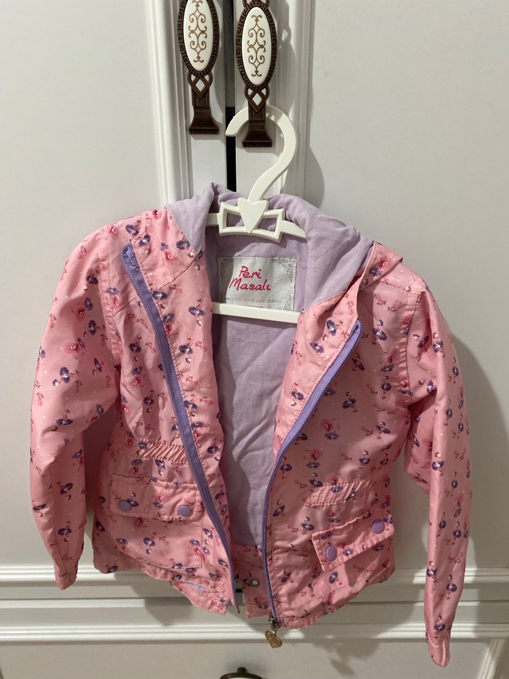 Pembe renkli, sentetik kumaştan yapılmış kız çocuk yağmurluğu, düğmeli ve notalı yaka detayına sahiptir. Gevşek kesimi ve pastel batik deseni ile sokak stiline uygundur. ☔️
