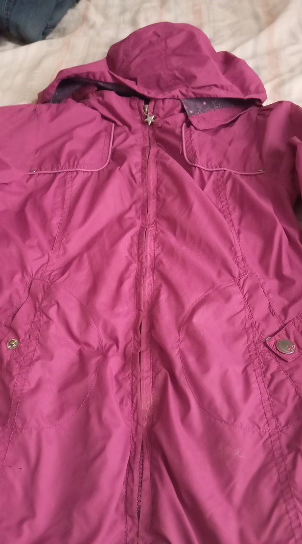 pembe renkte, düğmeli ve yakalı, bol kesim kız çocuk yağmurluğu. Sentetik kumaştan, sokak stili için uygun. ☔