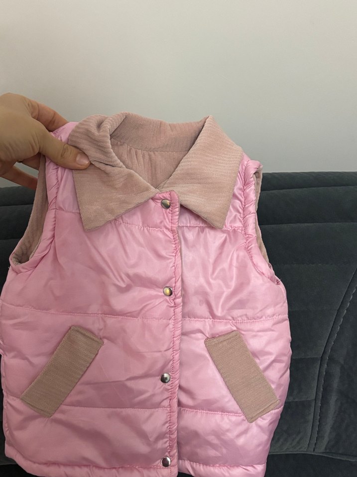 Pembe, düğmeli, yakalı ve kolsuz kız çocuk yeleği. Yumuşak sentetik kumaştan, dar kesim ve sade tasarımlı. Sokak stiline uygun, ön cepli yelek.