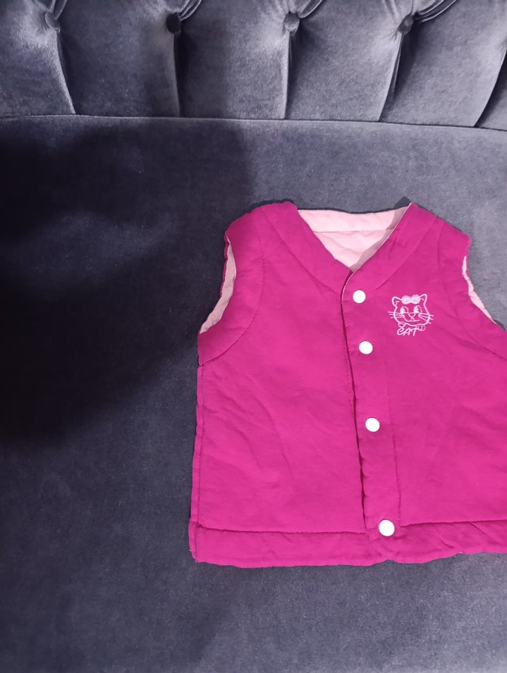 Kız çocukları için pembe, düğmeli, baskılı ve kolsuz yelek. Kayışsız yakalı, dar kesim, rahat ve sıcak kumaştan üretilmiştir. Çift taraflı kullanım