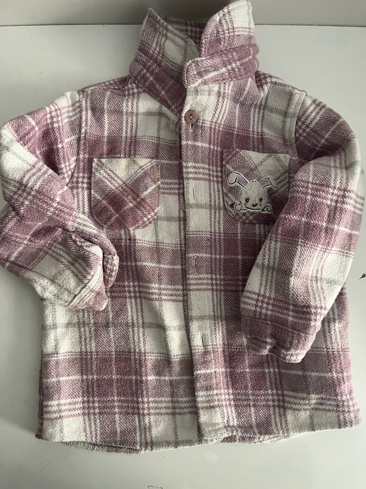 Kız çocuk için uzun kollu, düğmeli, yumuşak ve sıcak kumaştan yapılmış pembe-beyaz ekose gömlek. Cepte küçük tavşan nakışı bulunur.