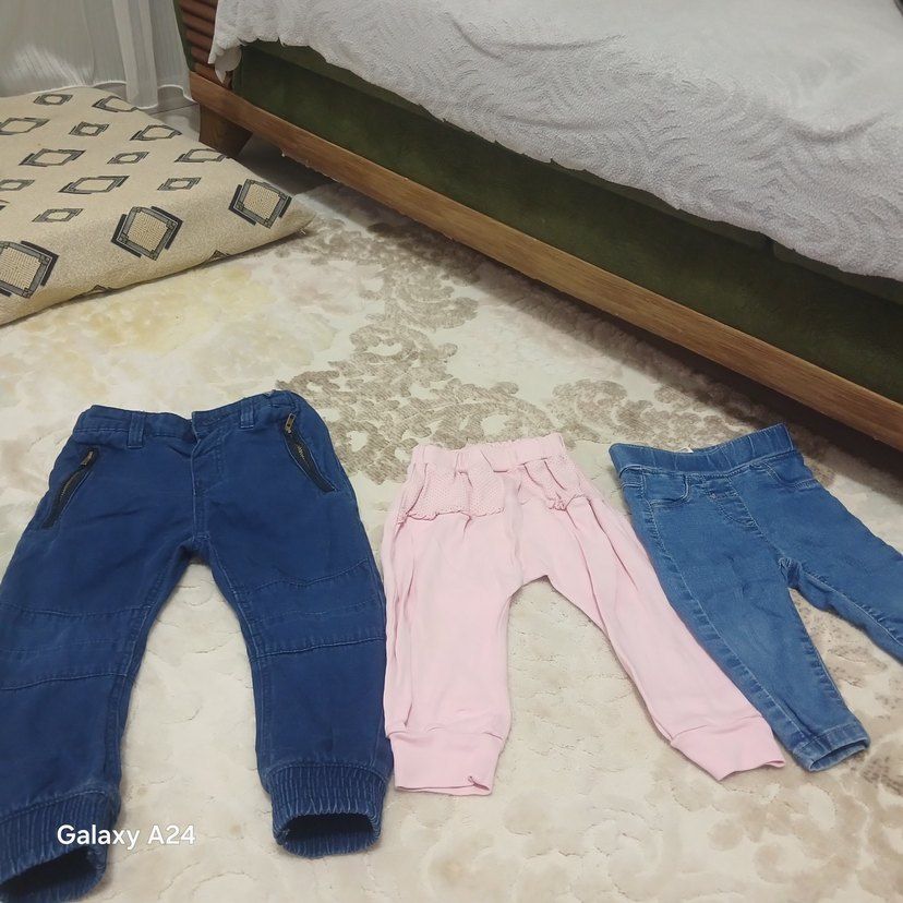 Kız çocukları için pembe renkli, elastik bel bantlı, bol kesim kot pantolon. Desensiz ve pastel renklidir, rahat ve gündelik tarzda.
