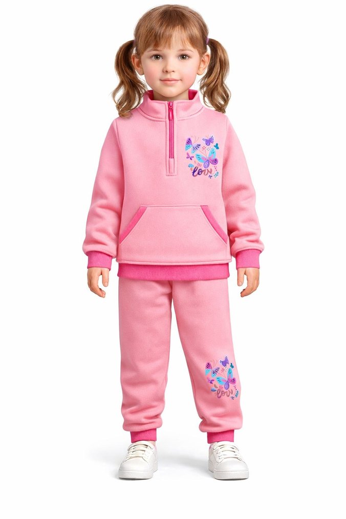 Kız çocukları için bol kesim, uzun kollu, fermuarlı ve yuvarlak yakalı pembe pastel tonlarda eşofman takımı. Kelebek baskılı, rahat ve sıcak kumaştan yapılmıştır. 3 iplik kalın her yaş mevcut