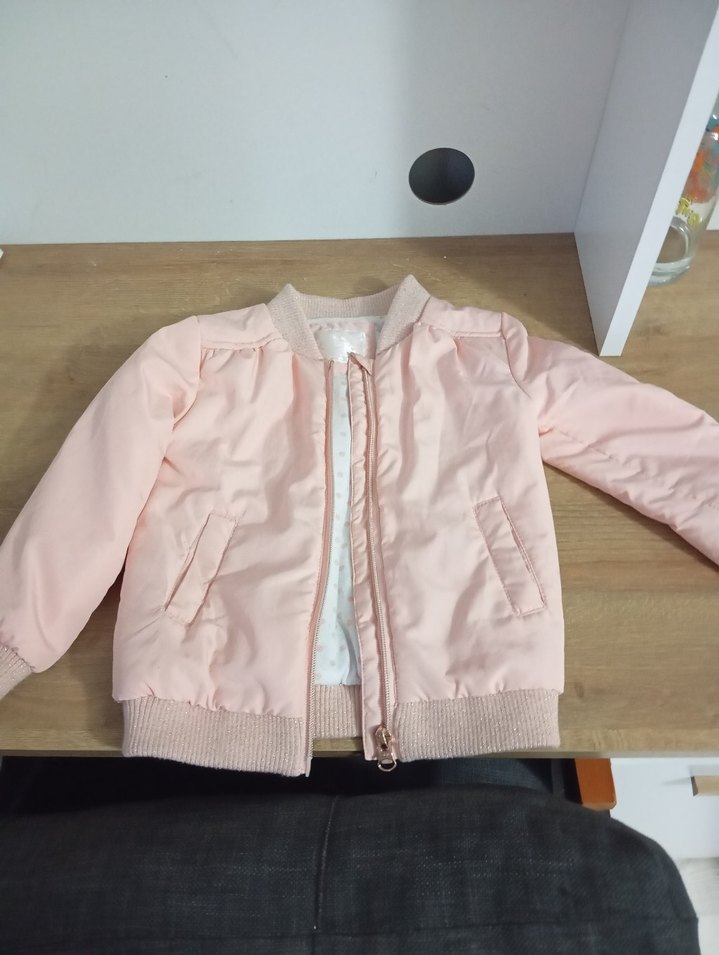 Kız çocukları için fermuarlı, düz ve ince kesim mont. Yumuşak ve sıcak kumaştan, pastel pembe renkte, günlük sokak stili için uygun.