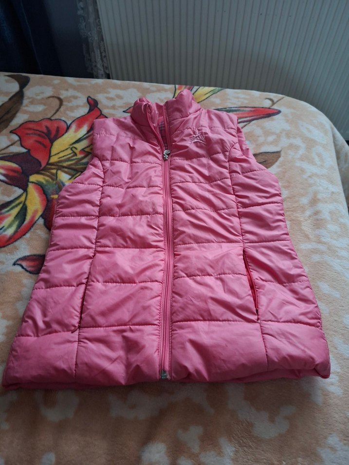Yumuşak ve sıcak kumaştan yapılmış, fermuarlı ön ve ince kesime sahip, kolsuz pembe yelek. Casual sokak tarzına uygundur.