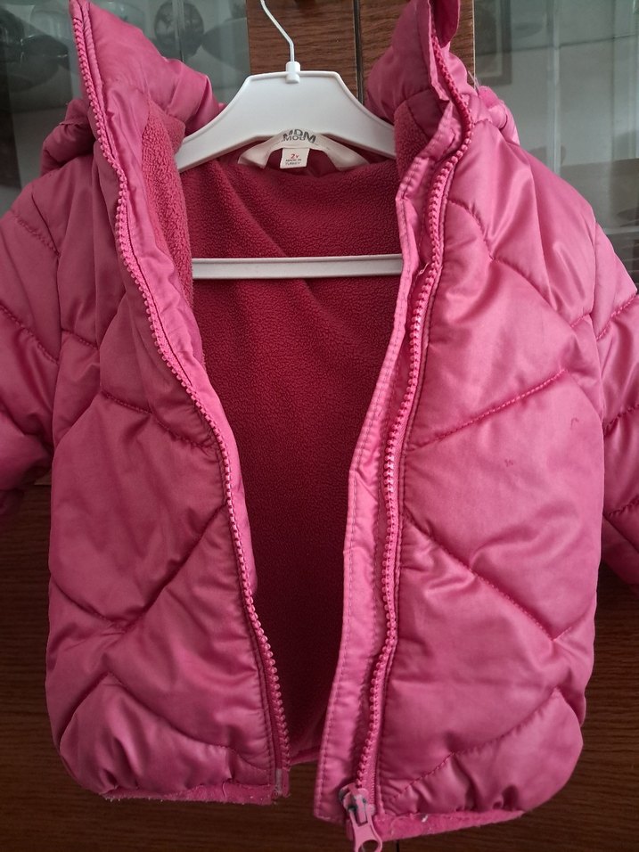 Fermuarlı, kapüşonlu ve parlak pembe renkte kız çocuk montu. İç kısmı yumuşak ve sıcak tutan kumaştan yapılmıştır.