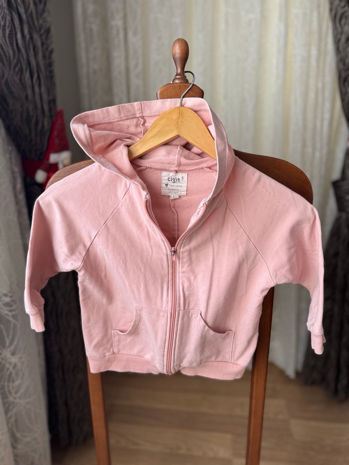 Uzun kollu, kapüşonlu ve fermuarlı kız çocuk sweatshirtü. Pastel pembe renkte Cigit marka 4-5 yaş