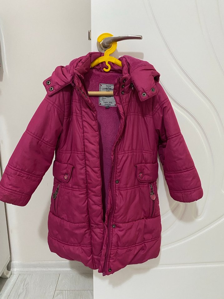 Fermuarlı ve yakalı, pembemsi renkli kız çocuk montu, sıcak iç astar ve ceplere sahip, günlük kullanım için uygundur. Fermuarı bozuk yenilenmeli fiyata yansıttım
