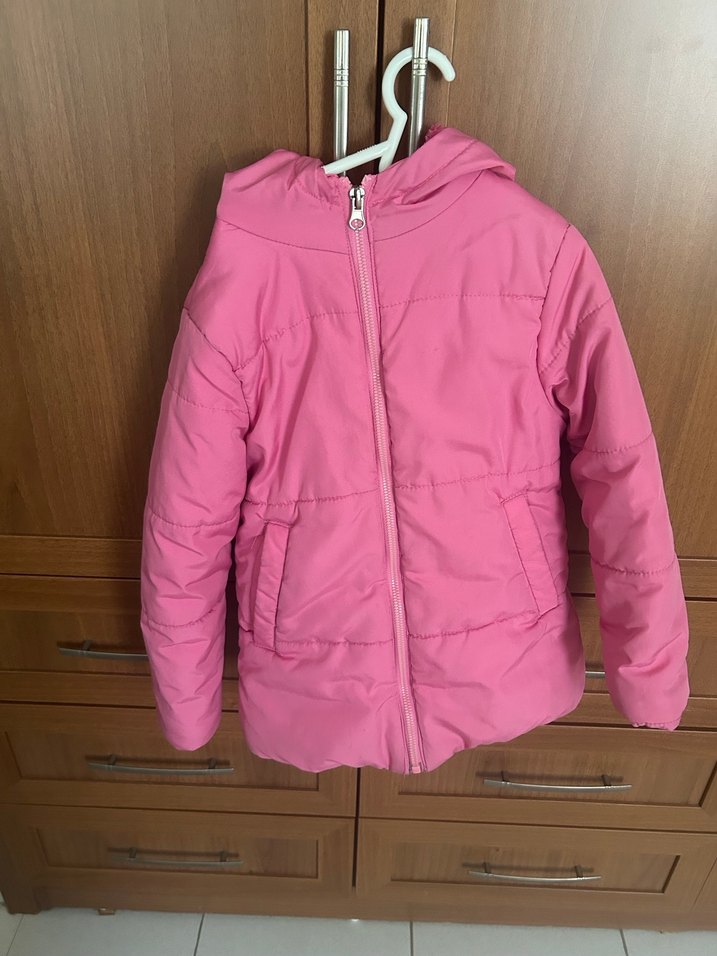 Kız çocukları için pembe, fermuarlı ve yumuşak kumaşlı, sade ve düz modelde, notched lapel yakalı, dar kesim mont.