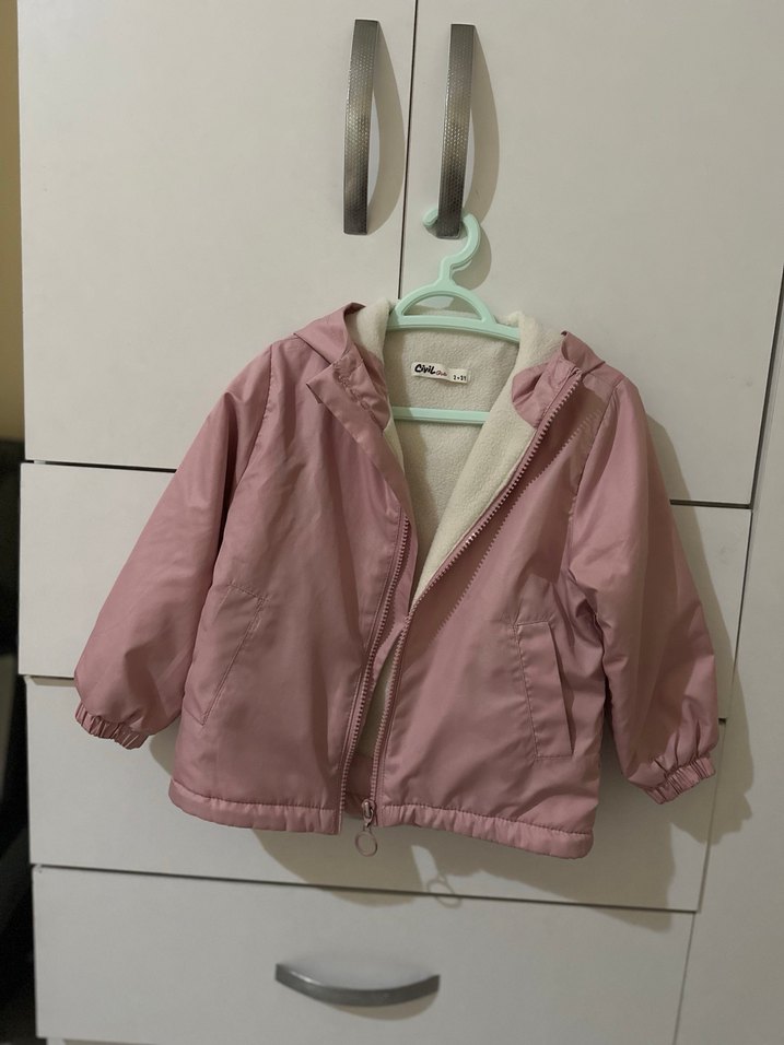 Bu pastel pembe kız çocuk montu, fermuarlı ön kısmı ve kesik yakasıyla bol kesimdir. Yumuşak ve sıcak tutan polar kumaştan üretilmiştir, desen içermez.