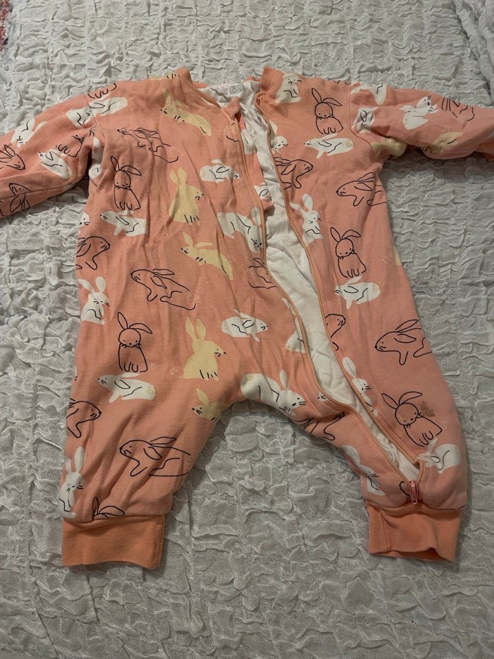 Yumuşak pembe polar kumaştan, yakalı, uzun kollu ve fermuarlı tulum. Sevimli tavşan desenleri içerir.