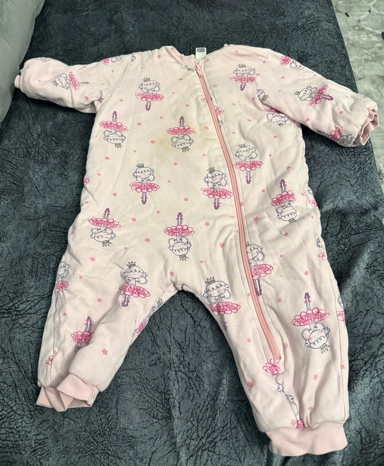 Kız çocukları için pembe renkli, fermuarlı ve uzun kollu polar uyku tulumu. Askısız yakaya ve bale figürlü pastel desene sahiptir. Üründe leke var. Fotoğrafta gözüküyor.