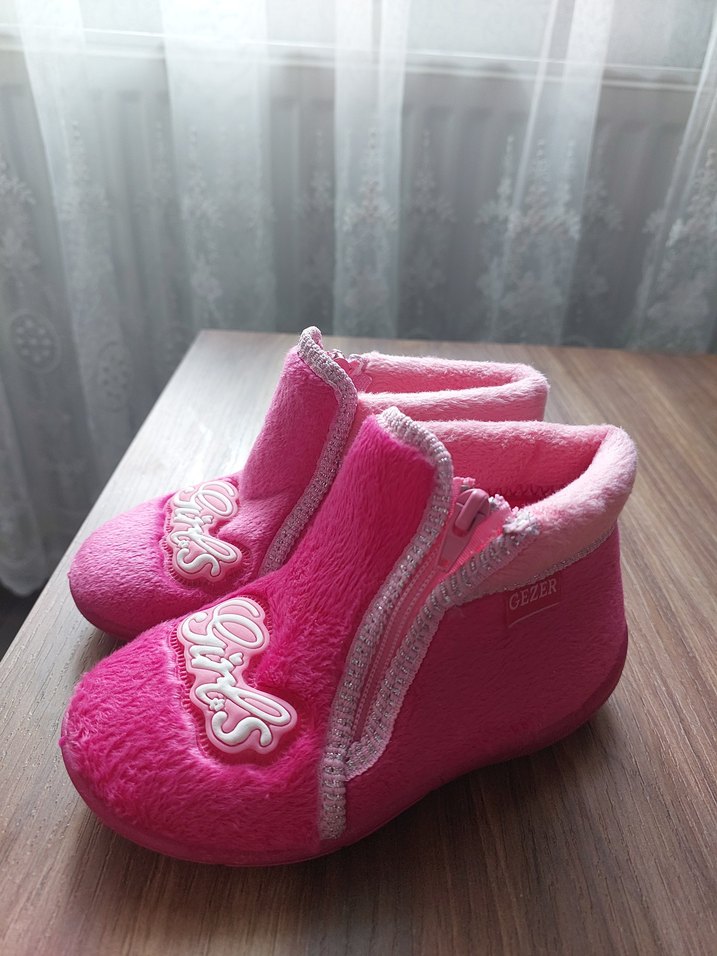 Pembe renkli kız çocuk terlikleri, yumuşak ve sıcak tüylü kumaştan üretilmiştir. Renkli nakış detayları ve kolay giyilebilen fermuarlı tasarımı vardır.