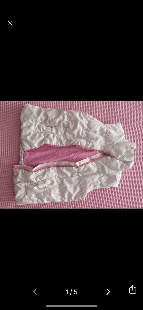Pembe beyaz renkte, fermuarlı, yakalı ve kolsuz, yumuşak sentetik kumaştan yapılmış kız çocuk yeleği. Sokak stili için uygun.
