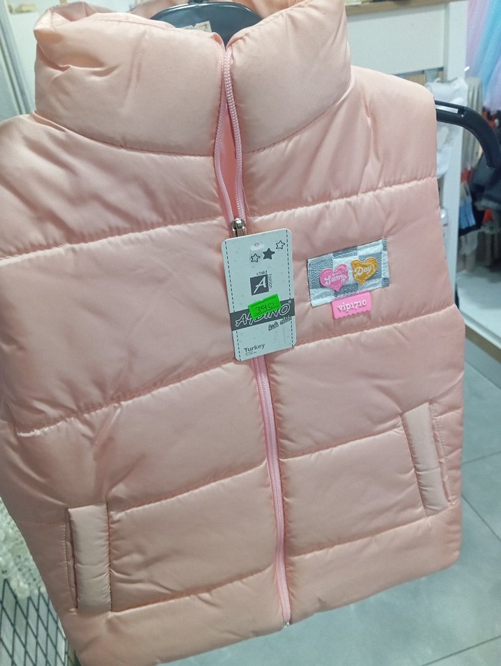 Yüksek yakalı, fermuarlı, pastel pembe tonlarında kız çocuk yeleği. 6 ve 7 yaşları kalmıştır