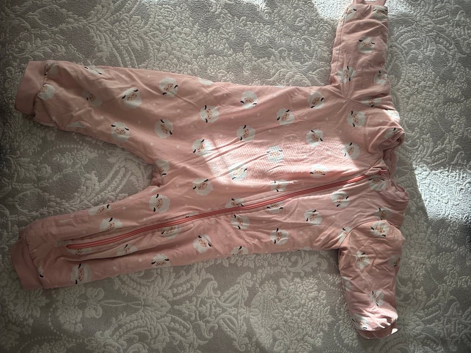 Pembe renkli kız çocuk uyku tulumu, fermuarlı ve uzun kolludur. Yumuşak sentetik kumaştan yapılmıştır ve V-yaka tasarıma sahiptir.