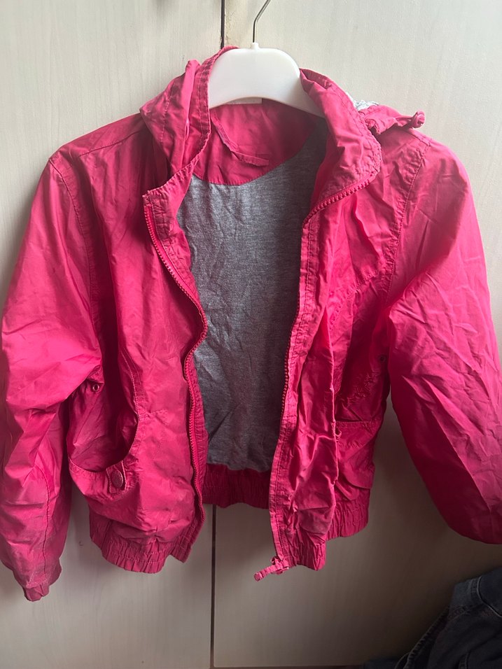 Pembe renk, yüksek yakalı, fermuarlı kız çocuk yağmurluğu. Dış yüzeyi sentetik kumaş, içi yumuşak gri astarlı, rahat kesim sokak stiline uygun. ☔️