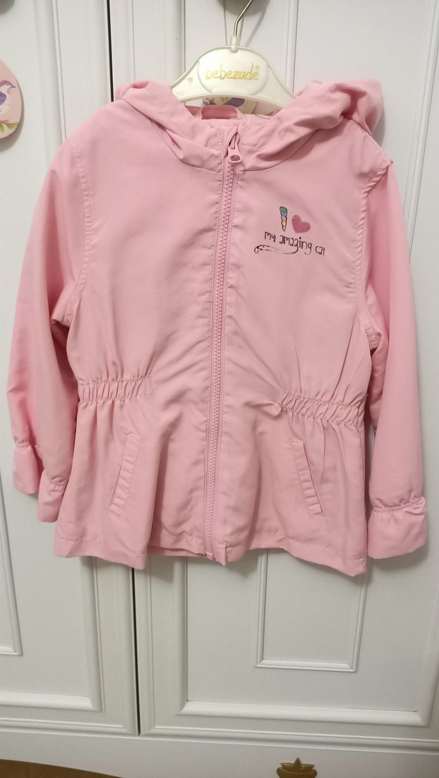 Fermuarlı, kapüşonlu kız çocuk pembe yağmurluk. Yumuşak ve sıcak kumaştan, baskılı detaylı, rahat kesim.