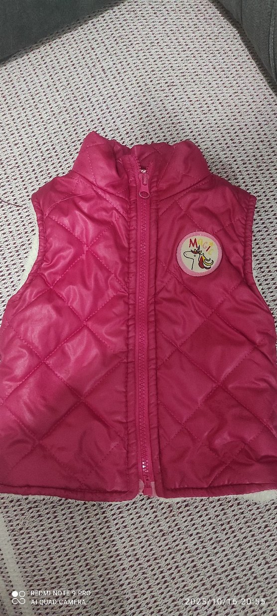 Fermuarlı, yakalı ve renkli işlemeli pembe kız çocuk yeleği. Yumuşak ve sıcak kumaştan, dar kesim sokak stili.