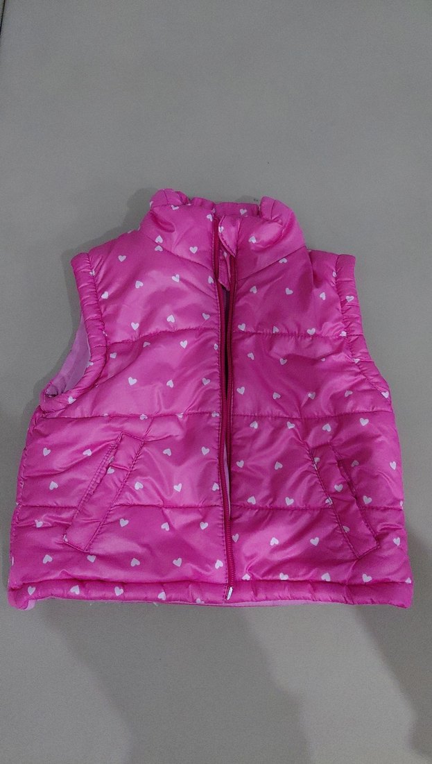 Kız çocuklar için fermuarlı, kalıp oturan, pembe yelek. Yumuşak ve sıcak tutan kumaştan, küçük kalp desenleriyle. Rahat sokak stili için uygun.