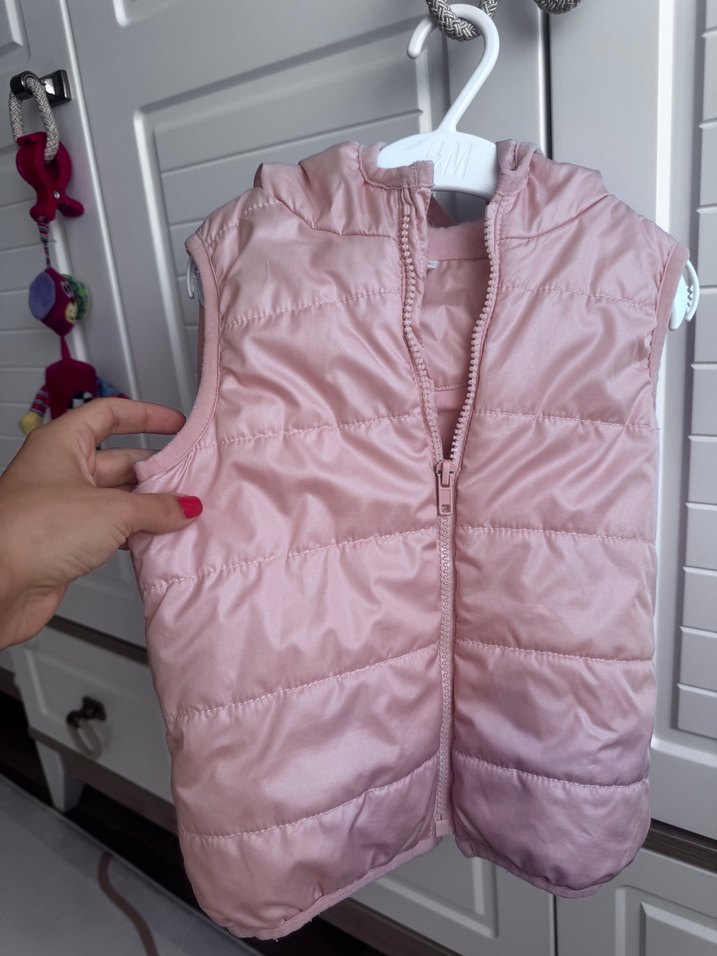 Pastel pembe renkte, fermuarlı, yakası kesimli, kolsuz ve sentetik kumaştan yapılmış kız çocuk yeleği. Sokak stiline uygun.