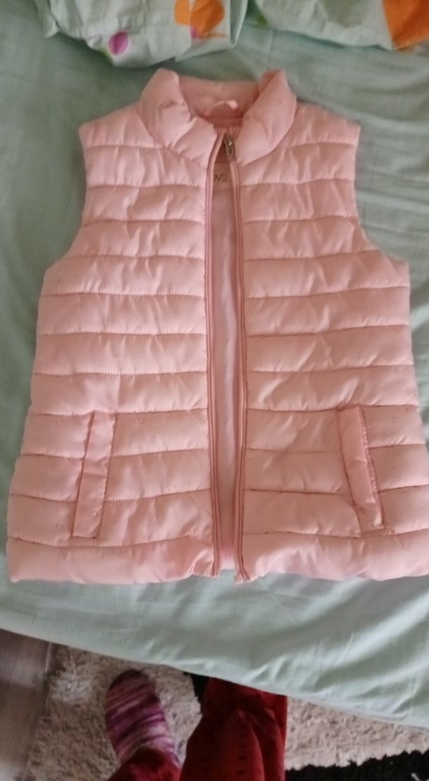 Pastel pembe renkte, fermuarlı, yüksek yakalı ve dar kesim kız çocuk yeleği.