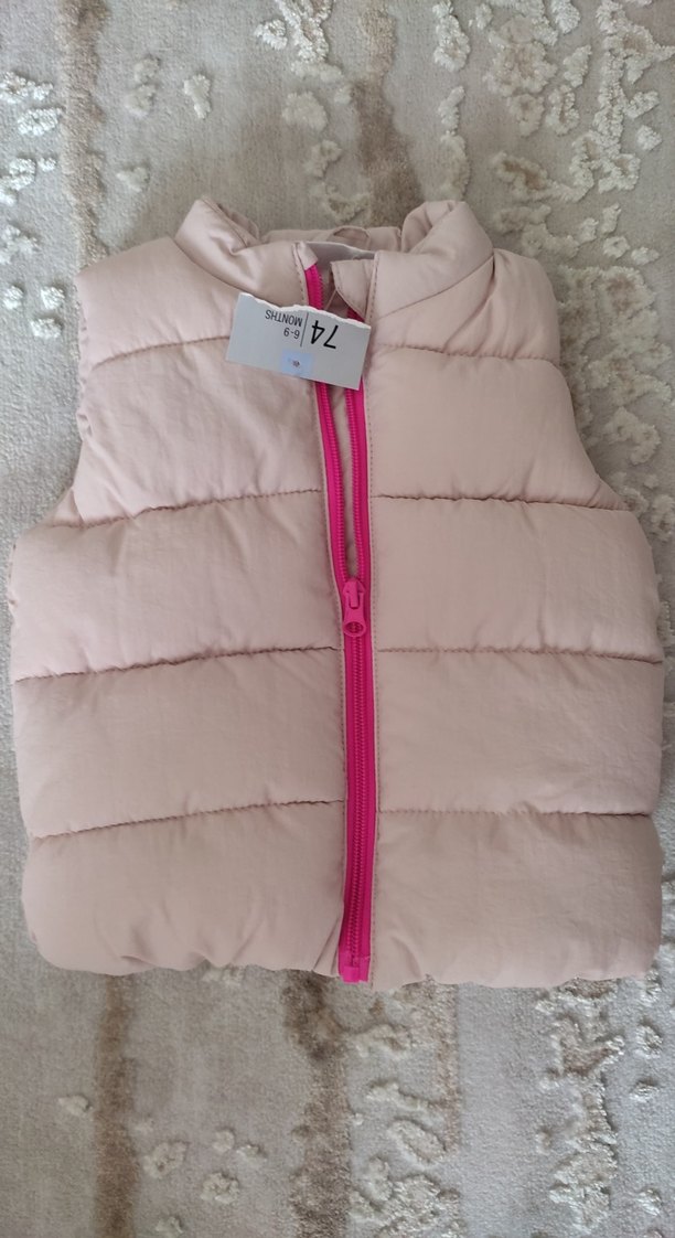 Kız çocukları için pastel pembe renkli, fermuarlı ve yakalı ince kesim yelek. Yumuşak ve sıcak kumaştan, kolsuz tasarımda, sokak stiline uygun.