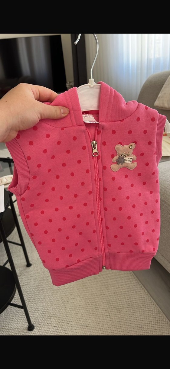 Yumuşak kumaştan pembe, fermuarlı ve kolsuz kız çocuk yeleği. Noktalı desenli ve ayıcık aplikeli, fit kesim ve notched lapel yakalı rahat sokak stili.