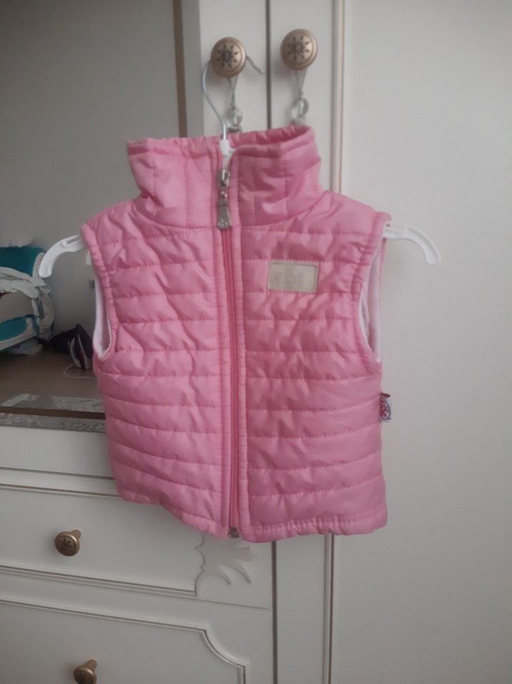 Fermuarlı, yüksek yaka ve dar kesim kız çocuk yeleği, yumuşak ve sıcak kumaştan, pastel pembe renkte.
