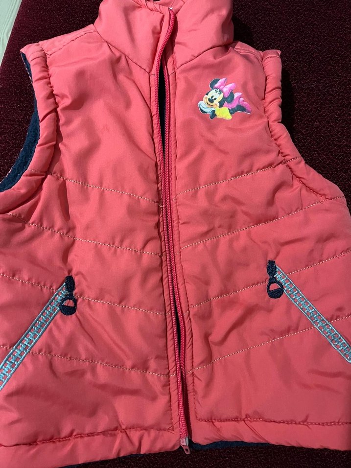 Pembe renkli, fermuarlı cepli ve Minnie desenli kız çocuk yeleği, yumuşak ve sıcak kumaştan, kolsuz ve dar kesimlidir.