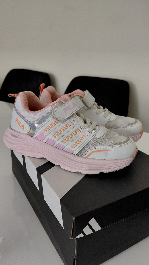Pembe renkli, baskılı pastel detaylara sahip FILA kız çocuk spor ayakkabısı, cırt cırtlı ve kauçuk tabanlıdır. sol önde hafif soyulma olmuştur onun dışında 2_3 defa giyildi sadece ayağına küçük almışız.