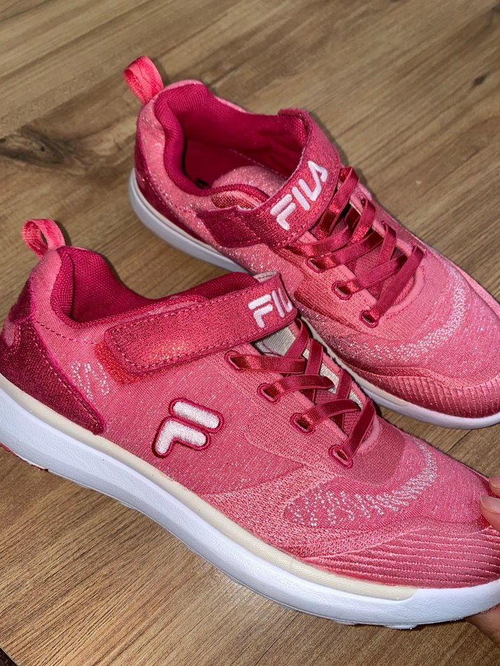 bir kere giyildi yurtdışından alındı Renkli baskılı detaylara ve Velcro bağlamaya sahip pembe kız çocuk spor ayakkabısı. Kauçuk tabanlı, 'S' işaretli ve Fila markalı sokak stili ayakkabı.