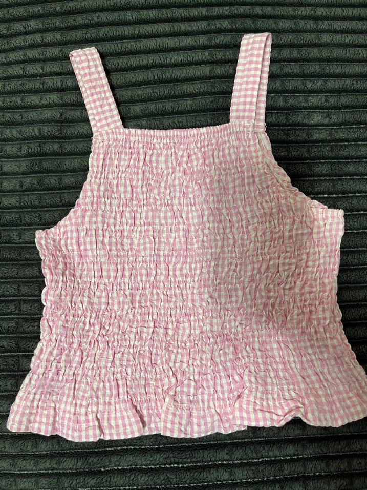 Pembe askılı, fit kesim, fırfırlı detaylı ve pastel tonlarda batik desenli kız çocuk üstü.