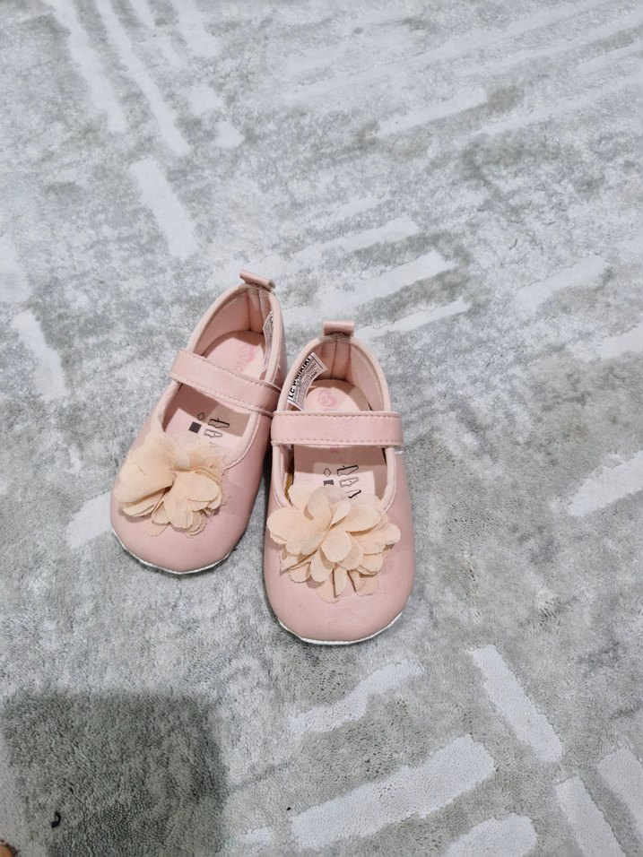 Kız çocuklar için pastel pembe renkte, çiçek desenli ve fırfırlı detaylı, rahat ve kullanışlı kauçuk babetler.