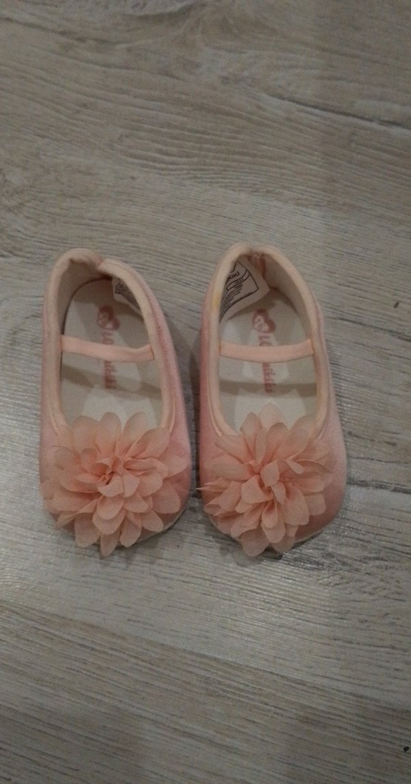 Kız çocuklar için pembe babetler, çiçek desenli fırfır detaylı ve yumuşak kauçuk tabanlı, sade ve klasik tarzda.