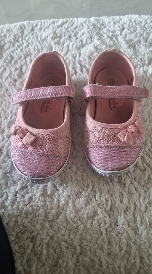 Kız çocukları için pembe tonlarda, fırfırlı detaylı ve yumuşak kauçuk tabanlı babet ayakkabı. Pastel renkli, desen içermeyen, kayışlı model.