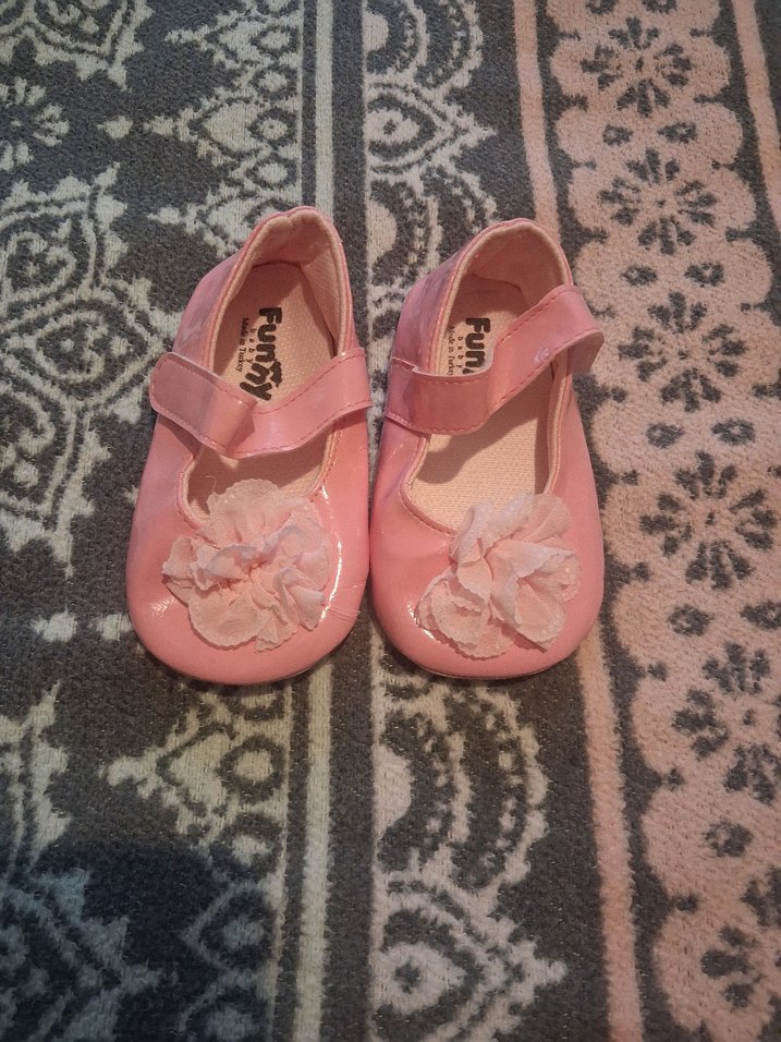 Pembe renkte, fırfırlı çiçek detaylı ve cırt cırtlı bantlı kız çocuk babet ayakkabı, kauçuk malzemeden üretilmiştir.
