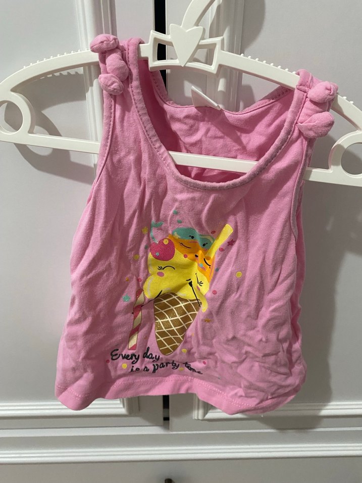Pamuklu, askısız, pembe tişört, fırfırlı detaylı ve renkli dondurma baskılı, rahat kesim, sokak tarzı için uygun.