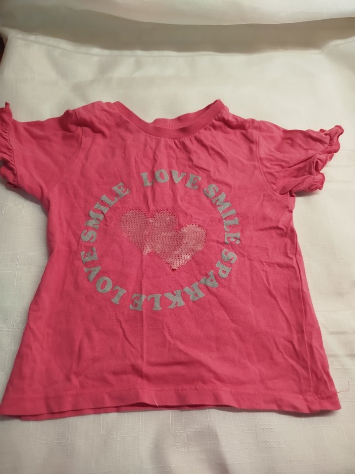 Pembe renkli, kısa kollu, yuvarlak yakalı kız çocuk tişörtü. Fırfırlı kollara ve renkli baskılı kalp ve yazı desenine sahiptir. Yumuşak sentetik kumaştan, bol kesim.