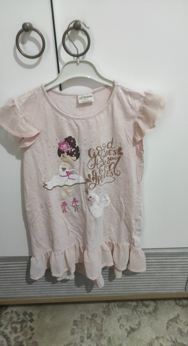 Pastel pembe renkli, kısa kollu, fırfırlı kız çocuk tişörtü. Pamuklu kumaştan, yuvarlak yaka ve bol kesimlidir, baskılı ve fırfır detaylıdır.