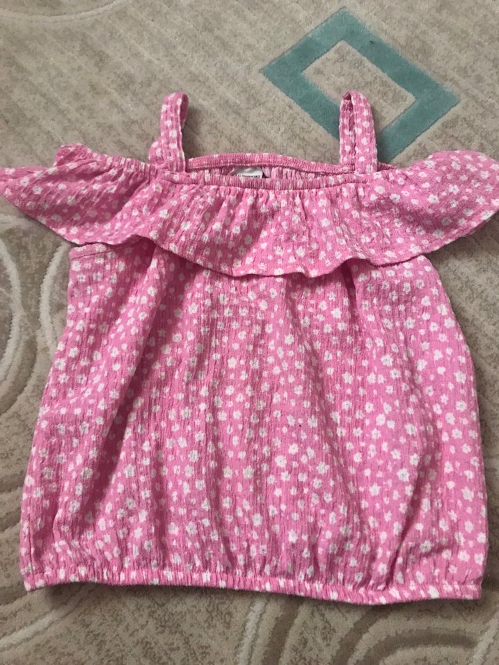Kız çocuklar için pembe, fırfırlı ve askılı straplez yaka bluz. Yumuşak sentetik kumaştan, bol kesim ve pastel tonlarda desenli.