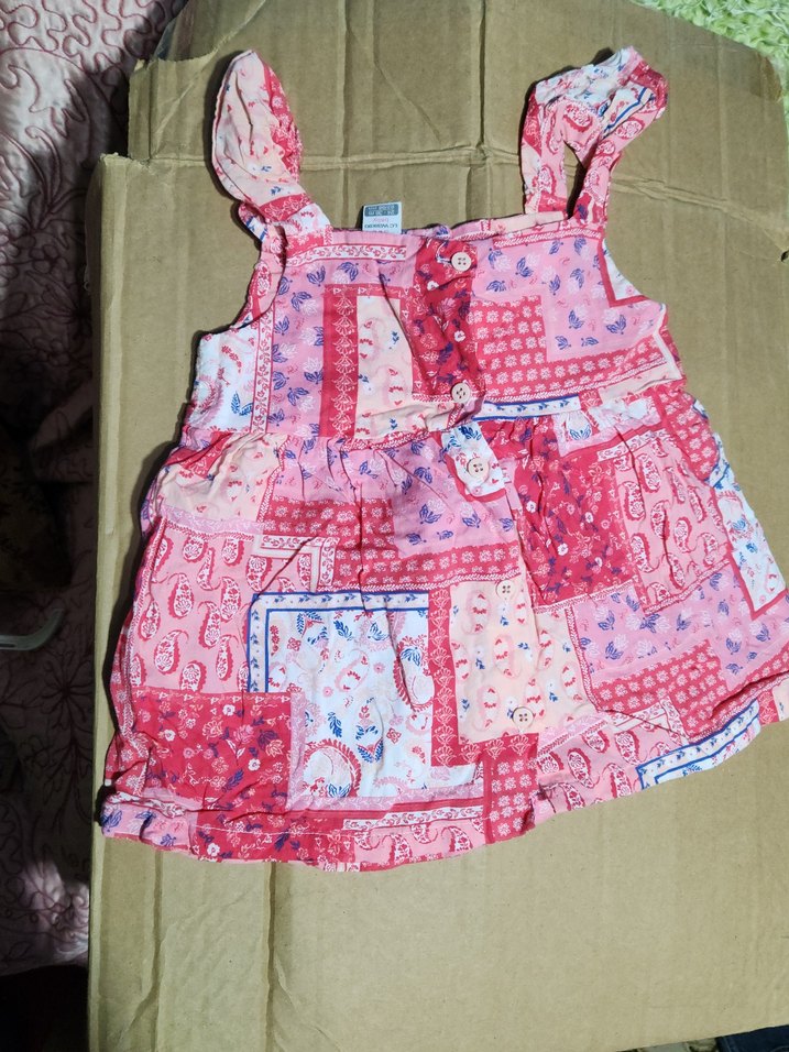 Renkli pembe, askısız, fırfırlı detaylı, bol kesim bohem tarzı kız çocuk elbisesi.