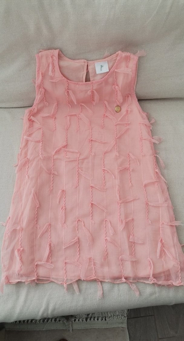 Pembe renkli, fırfırlı işlemeli ve kolsuz bohem tarzda kız çocuk elbisesi. Yumuşak pamuklu kumaştan, rahat kesimli ve şık görünümlü. Sorunu yok.