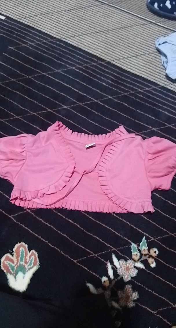 Kız çocuklar için pembe, kısa kollu, straplez yaka ve fırfırlı detaylara sahip, yumuşak ve sıcak dokulu, sade ve pastel renkli bolero.