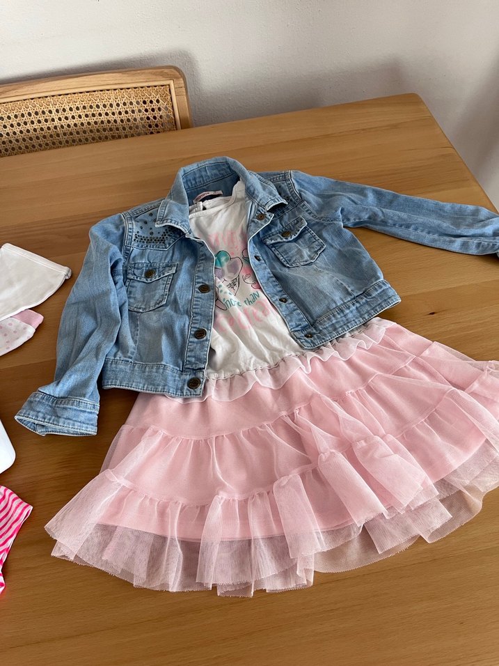 Fitted kesim, pastel pembe renkte, fırfır detaylara sahip bolero.Yuvarlak yaka ve batik desen bulunur. Kot ceketi ile beraber satıyorum