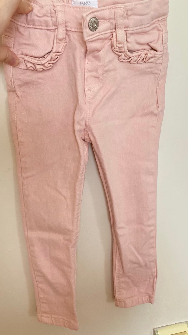 Yumuşak keten kumaştan yapılmış, pastel pembe renkte, ceplerinde fırfır detaylı dar kesim kız çocuk pantolonu. Trendy günlük stil için uygundur.