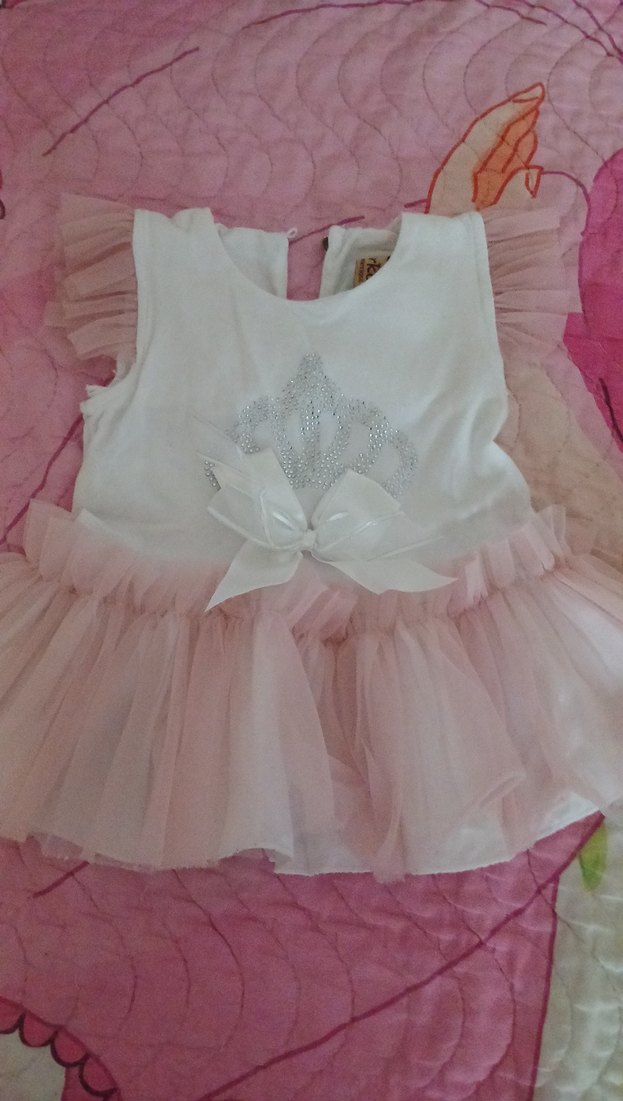Kolsuz, fırfırlı detaylı ve işlemeli desenli pembe elbise. Straplez yakalı, vücuda oturan kesimde, yumuşak sentetik kumaştan yapılmıştır. 3/6 6/9 uyumludur
