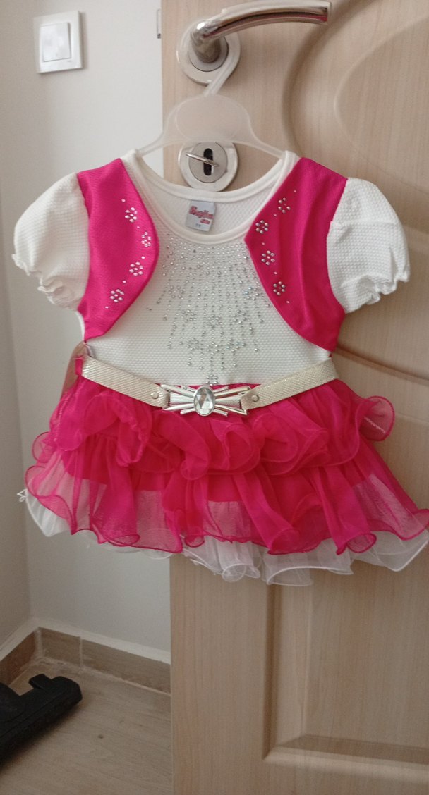 Pembe fırfırlı, askısız yakalı ve renkli desenli kız çocuk elbisesi. Yumuşak sentetik kumaştan olup, şık bir kemerle tamamlanmıştır.