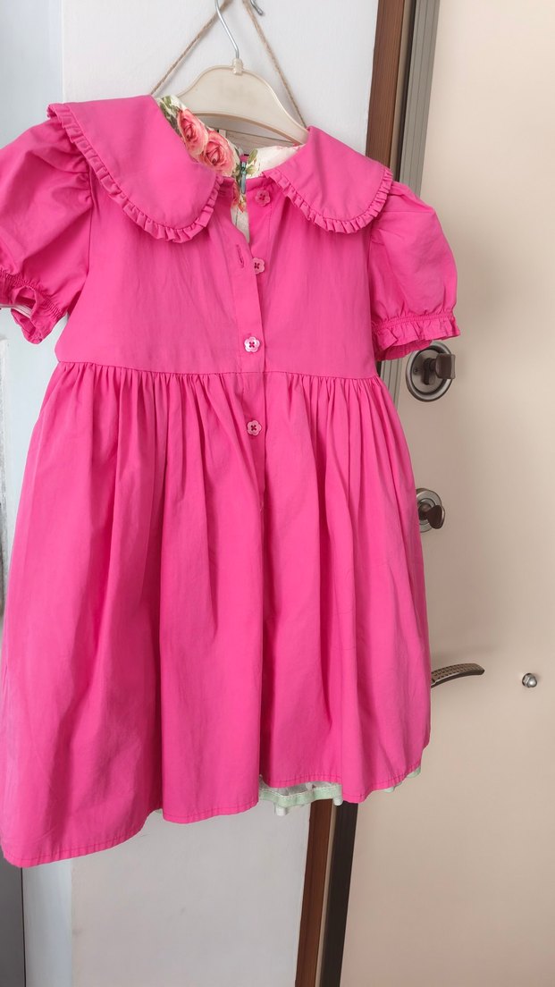 kumaştan, yakalı ve fırfırlı detaylı, bol kesim pembe kız çocuk elbisesi. İnce askılı ve pastel tonlarda rahat bir modeldir. ürün bir kez gıyıldi